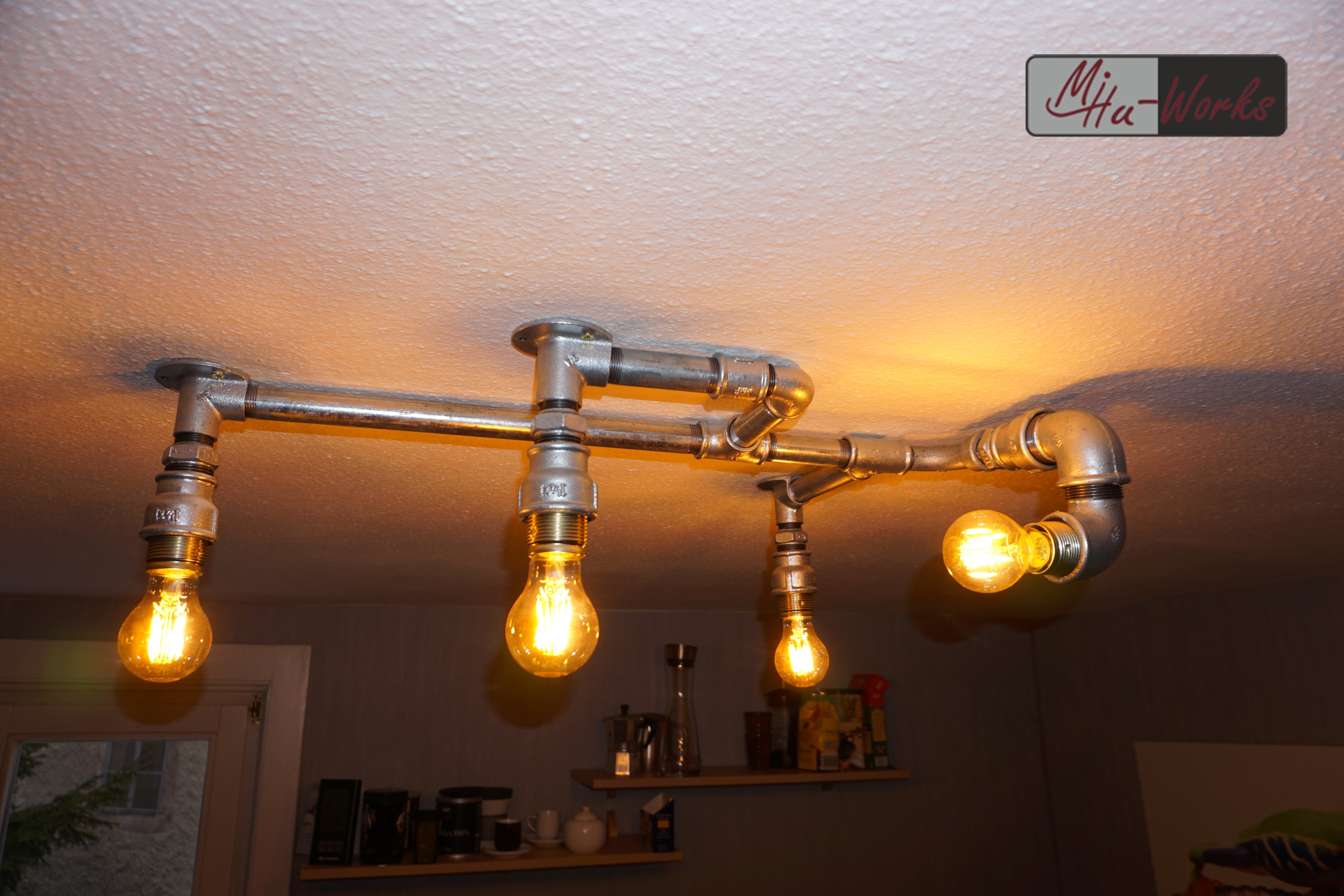 Als endlich alles fertig war, musste die Lampe nur noch an der Decke angebracht werden. Hierfür sind die Deckenwinkel schon mit Bohrungen versehen, welche das Anschrauben deutlich vereinfachen. Das geeignete Leuchtmittel musste noch gefunden werden, der Markt ist riesig und die richtige Farbtemperatur der Lampen ist mit ausschlaggebend, welche Stimmung im Raum erzeugt werden soll. Ich habe mich zunächst für eine Retro-Glühbirne mit 2400K entschieden. Dieses ist auf den Fotos zu sehen und war perfekt um die Lampe in Szene zu setzen.Aber als Haupt-Küchenbeleuchtung eher nicht. So habe ich mich letztendlich für die 2700K Variante entschieden.